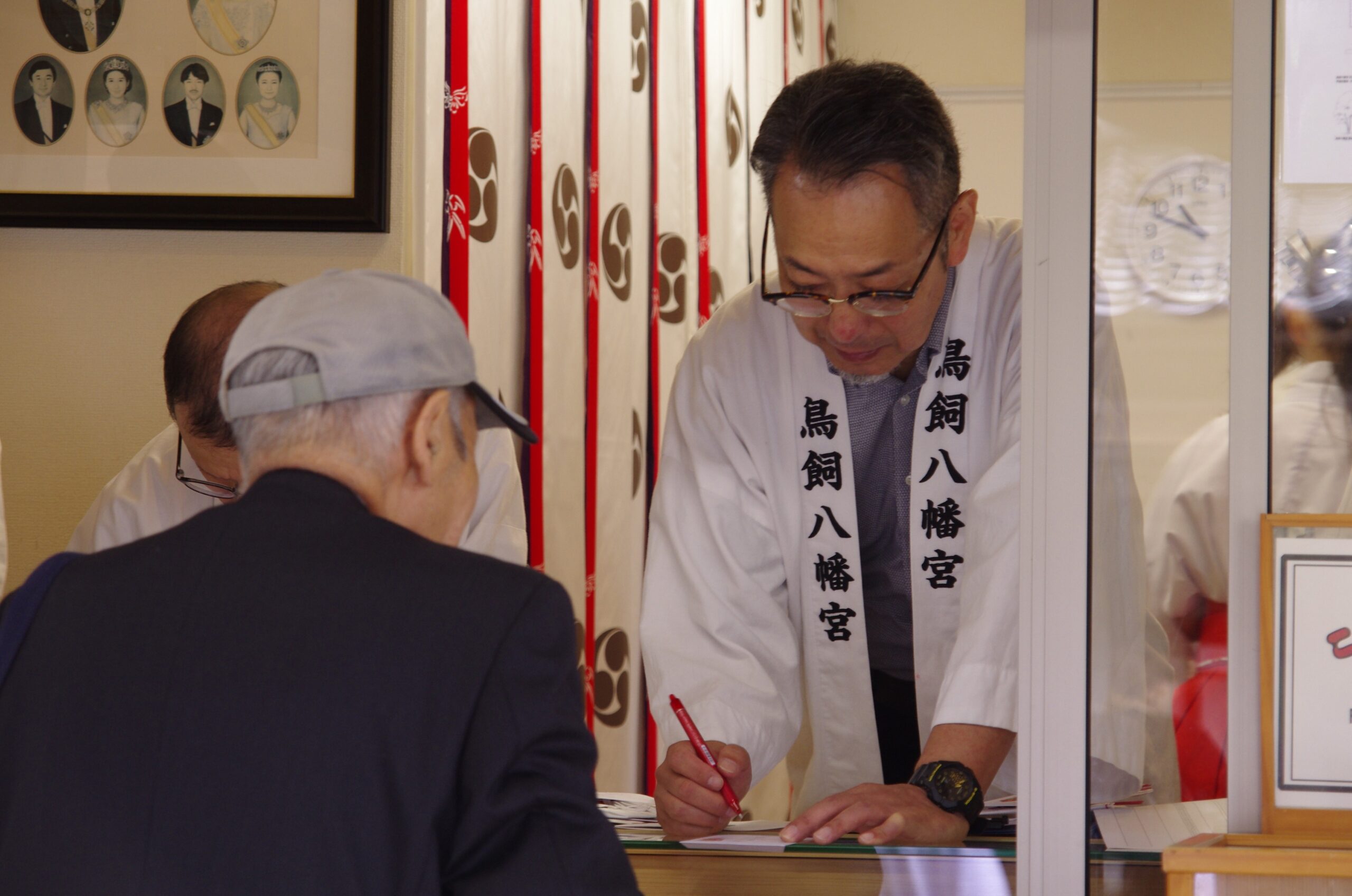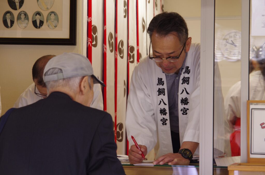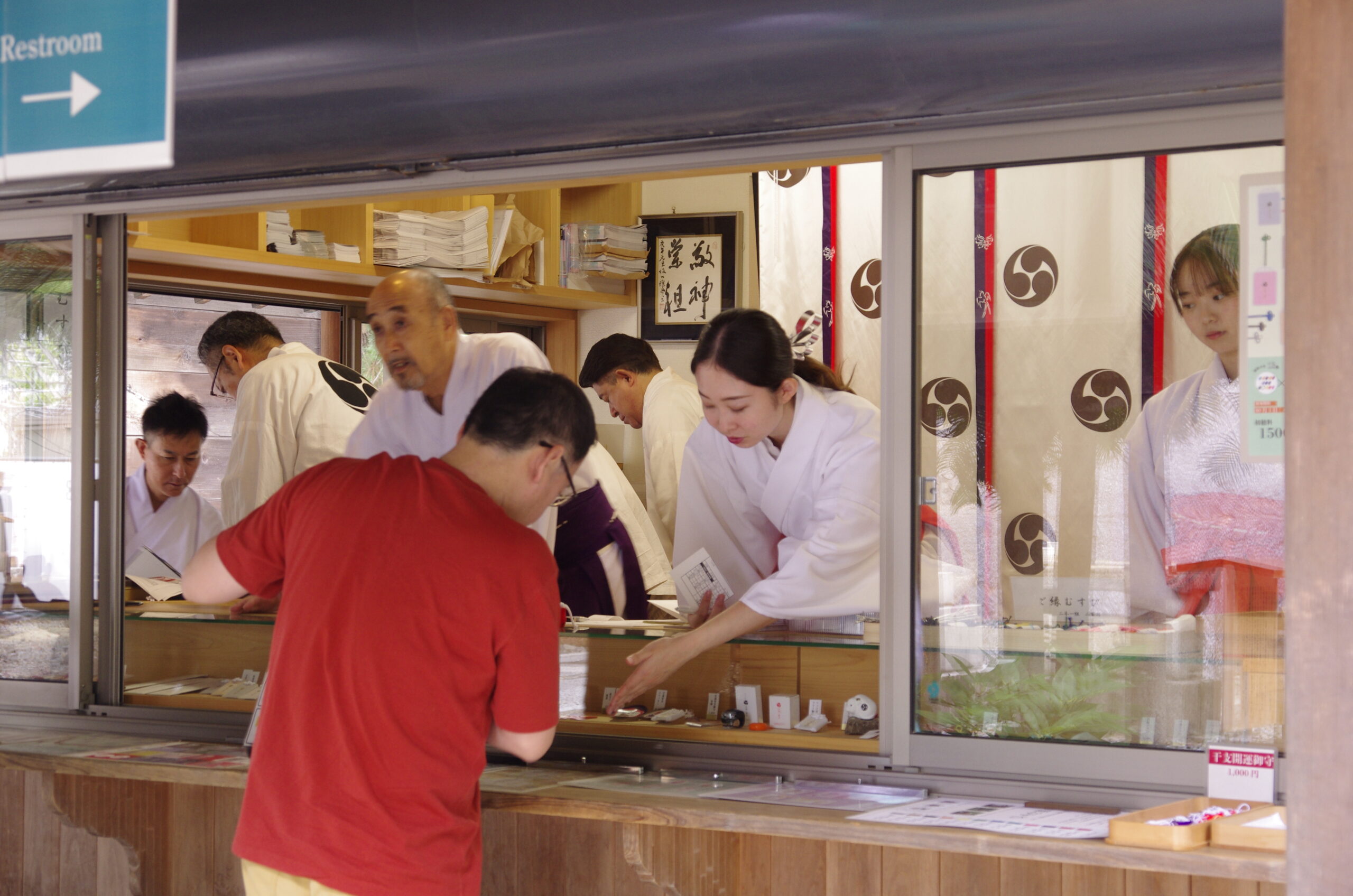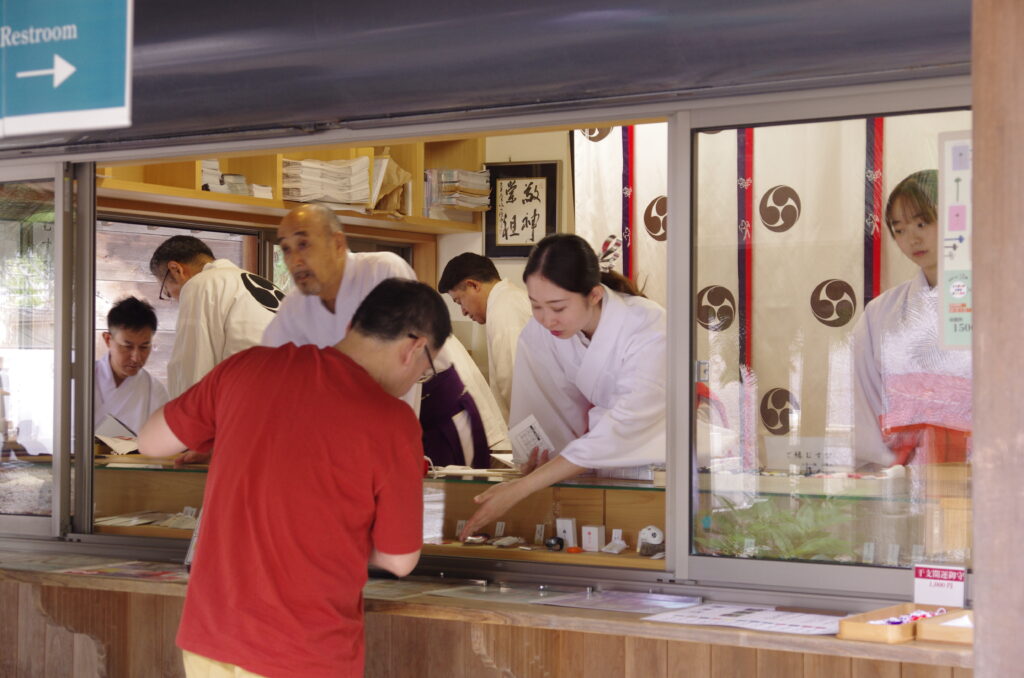 巫女さんたちは御朱印などの通常頒布を窓口にててきぱきとご案内しています。