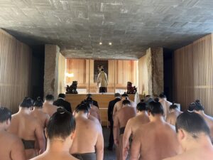 赤ちゃん土俵入りの前に、九重部屋の必勝祈願とお子様の成長祈願を行い、力士全員をお清めしています。