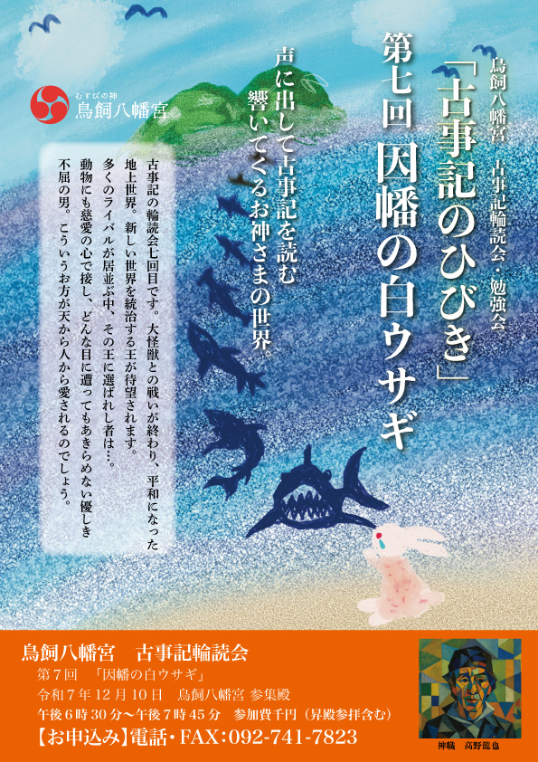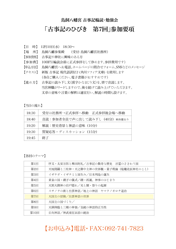 また、途中から参加された方で「最初から読みたい」という方や「土日なら参加できるのに」という方も多いので、1月31日(土)14時から『古事記輪読会(乙)第一回』を開催します。