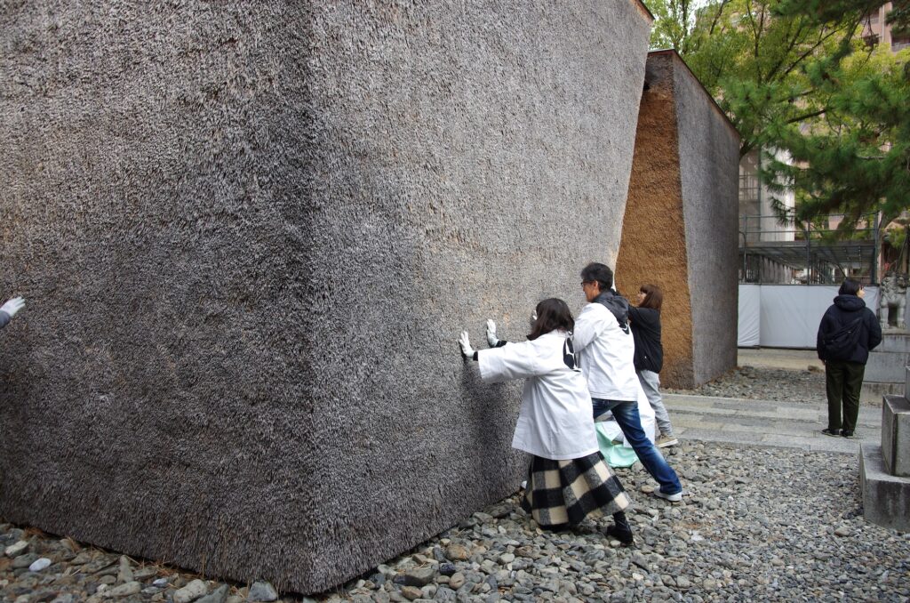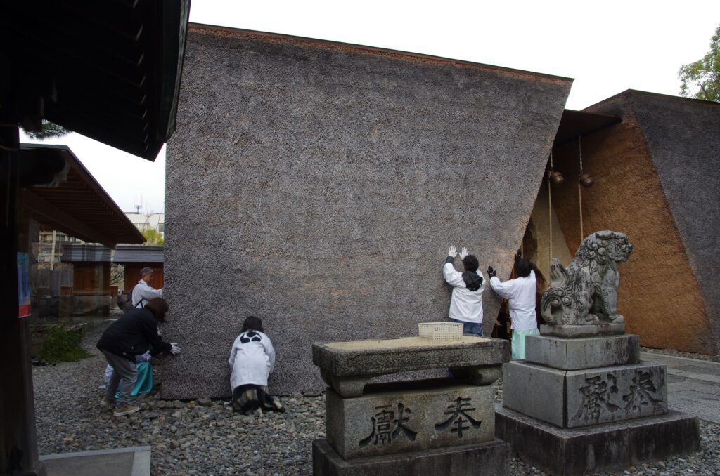 最初に行ったのは、拝殿の茅葺き壁の補修です。といっても難しいことはありません。