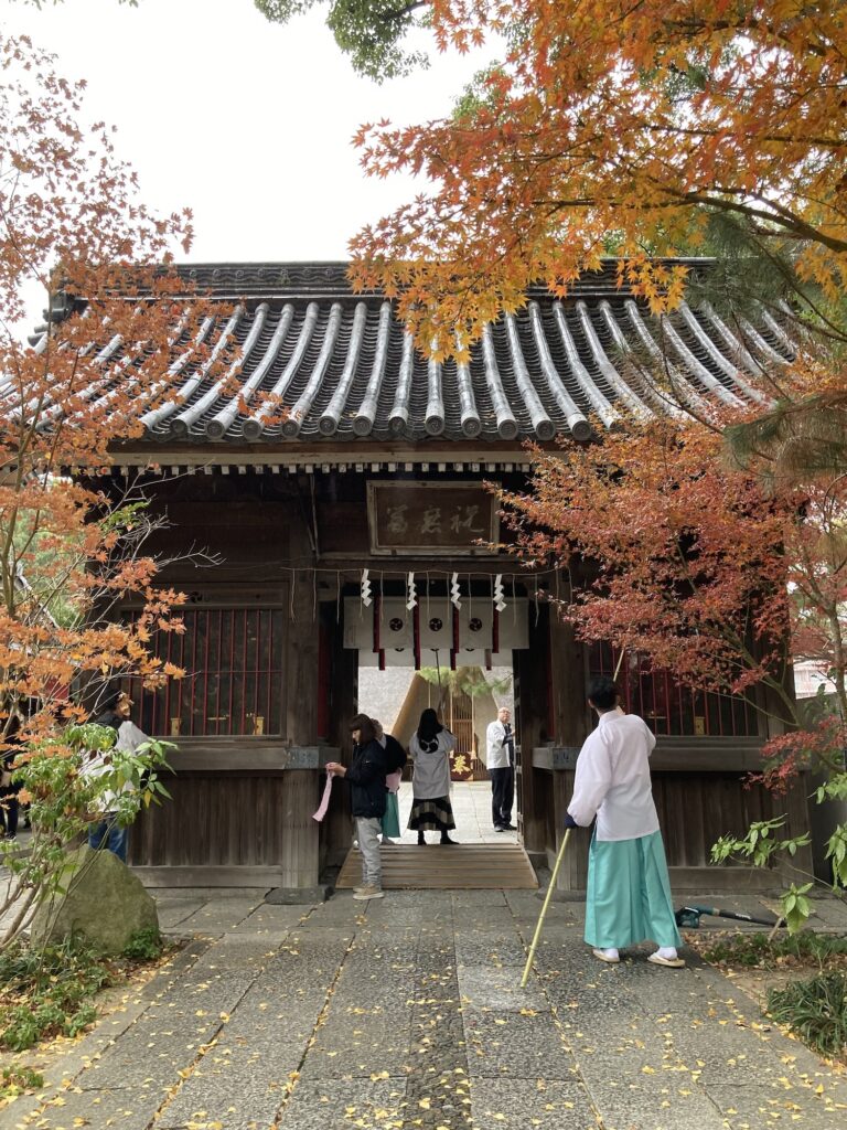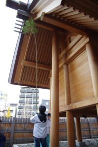 屋根や軒の枯葉や埃を落として、水拭きです。御神門は常に風雨にさらされていますし、また歴史も重ねています。それを掃除していると自分の手で実感できます。