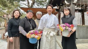 そして手水の中には花を飾り付けています。お花を選び、アレンジして、奉納してくださったのは、「いけばな教室いざなう 鳥飼八幡宮教室」の皆さまです。