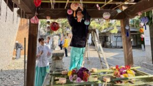 手水舎の屋根から手鞠と千代紙の飾りを。