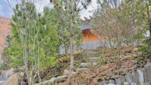 本殿後ろの斜面を整えました。木々を植え、石を置きました。階段をしつらえていますので、本殿への裏参りにお通りください。