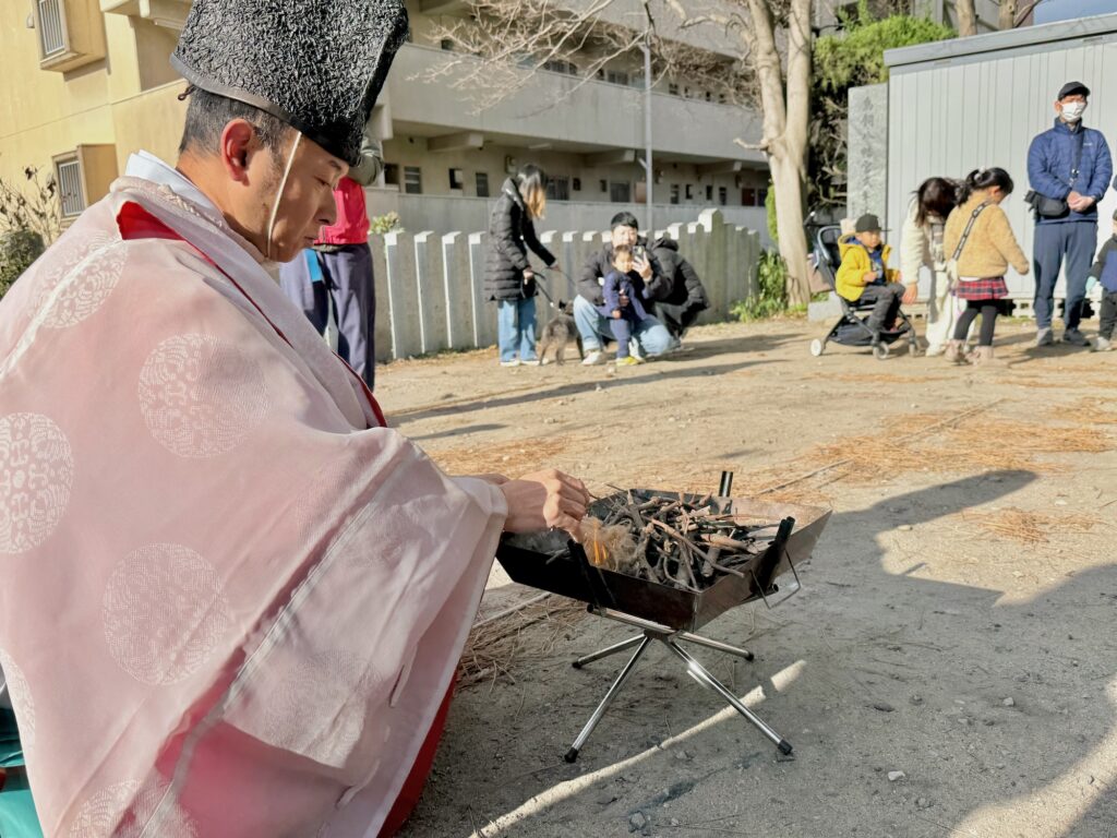 どんど焼きは当宮神職の修祓、火付の儀を経て、地域の児童の皆さんによる点火で始まりました。
