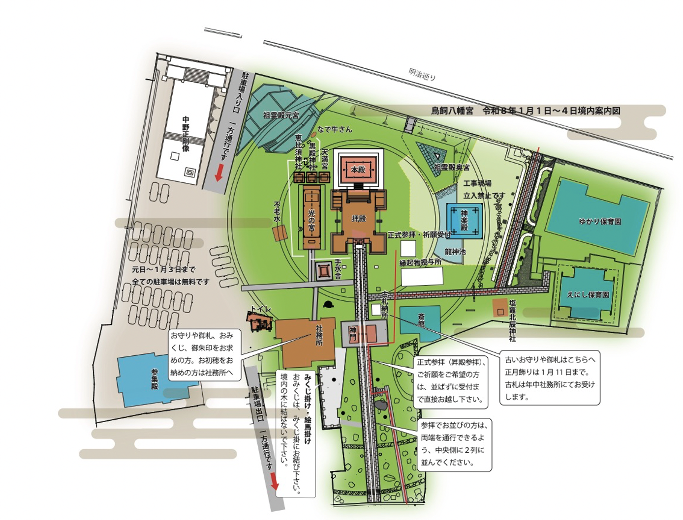 みなさまがスムーズにご参拝いただけるよう、準備しております。当宮にて、新年での躍進を誓い、ご自身と近しい 方々のご安寧をお祈りください。