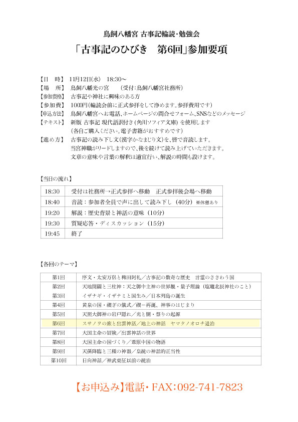 古事記輪読会「古事記のひびき」第6回のお知らせです。