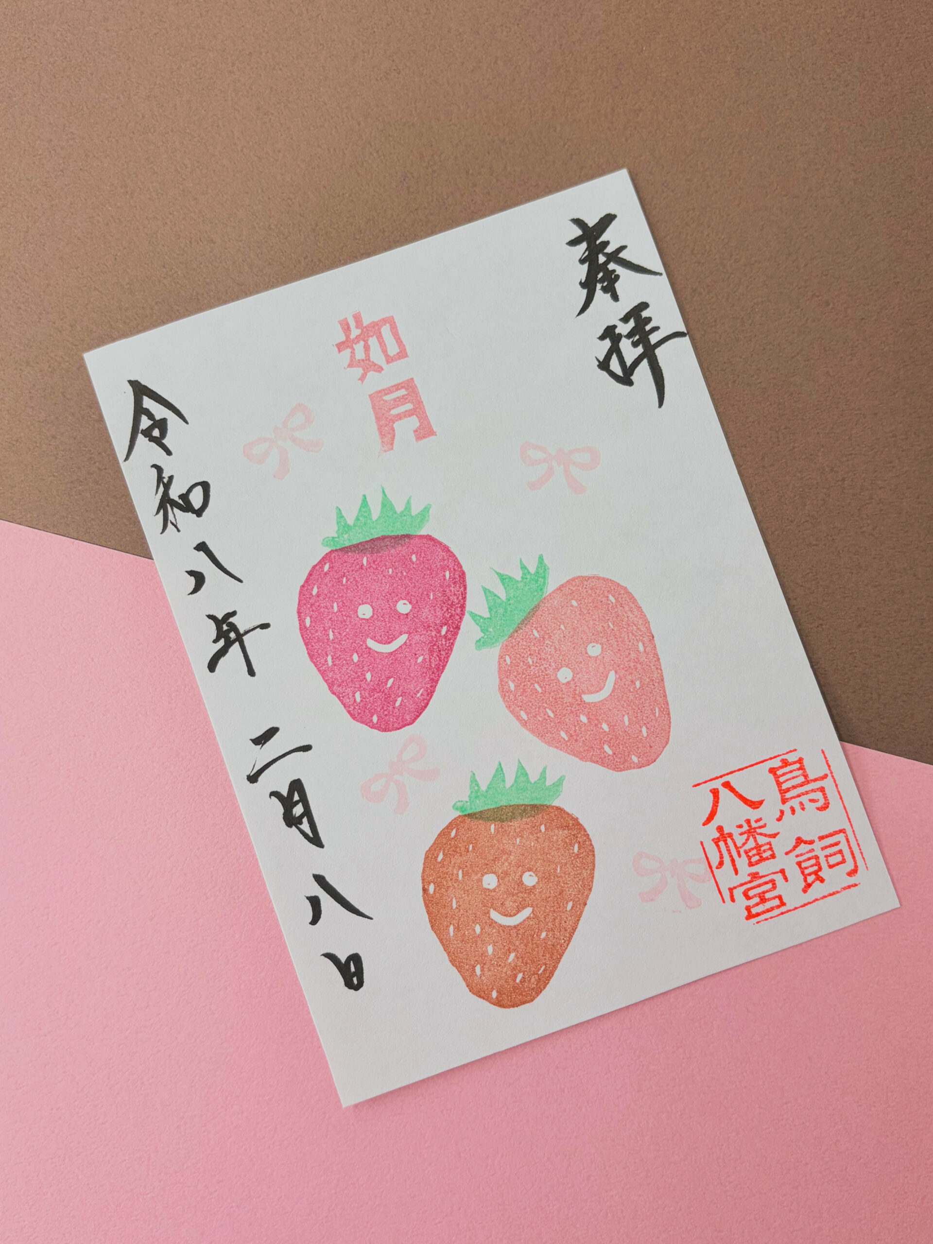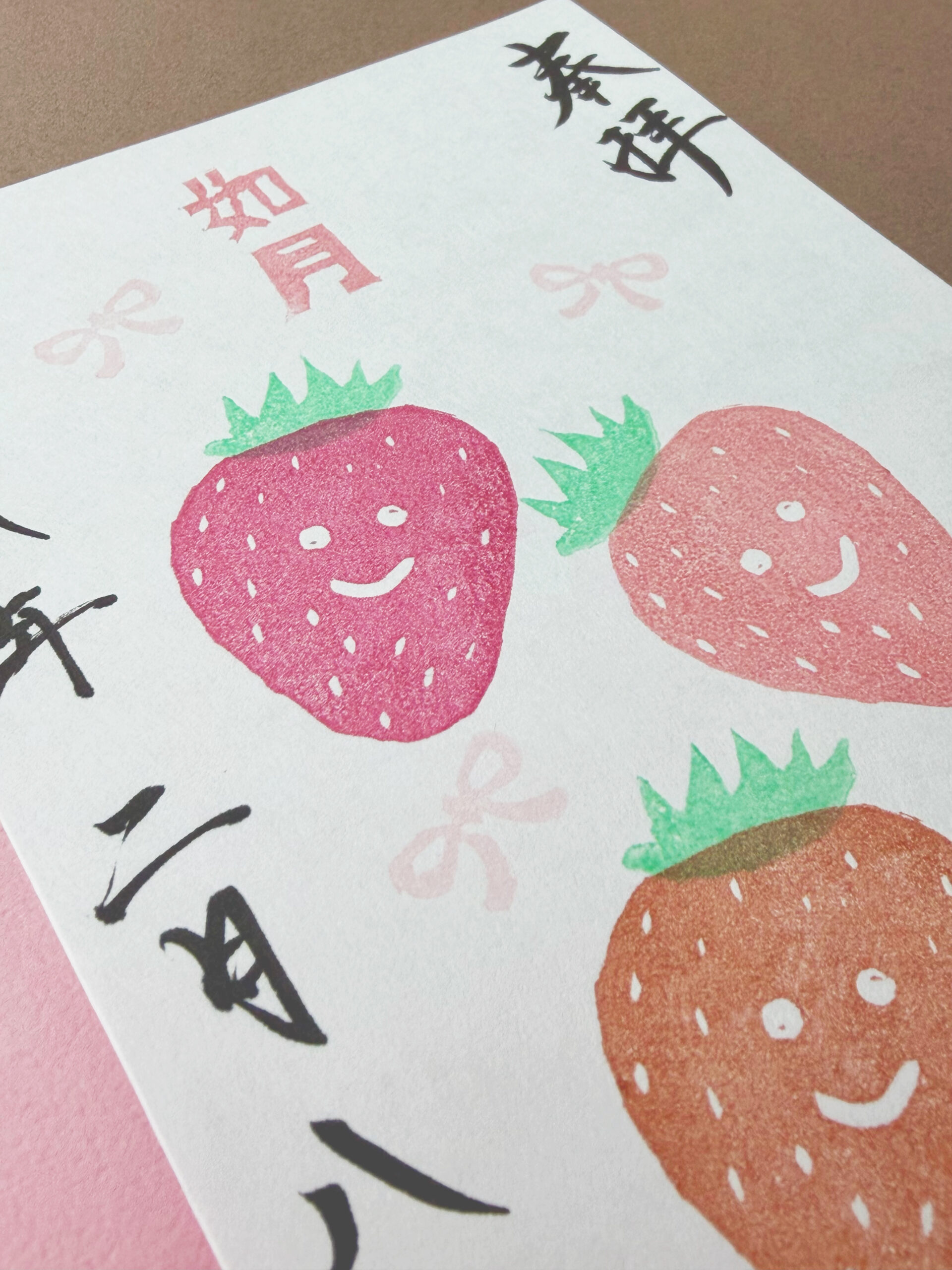 毎月頒布している福マルシェ記念御朱印は旬のイチゴがテーマです。